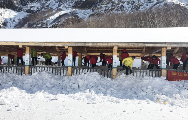 2017年3月5日,40余名志愿者在北景區老山門候車亭前集合,前往瀑布回廊清雪。長白山由于特殊的地理位置和氣候,冬季雪期長、雪量大,經過一年積淀,回廊內積雪平均厚度已達1.5米,面對艱巨的任務,志愿者們用高漲的熱情對抗天寒地凍,經過個6小時的奮戰,下午三點回廊積雪被清掃一空,為迎接游人的到來做好了準備。